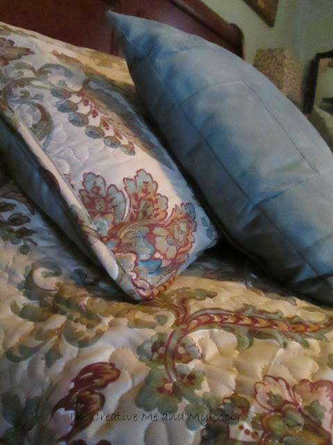 When we were in Michigan last weekend we went to The Christmas Tree Shop...Have you ever been there?? A lovely store with much more than Christmas decorations...that's where I spotted my new LOVELY...for just $29...that's right a queen size quilt with 2 shams that came in a matching tote bag for that low price. It had the blues in it that I wanted but also some gold and rust and a darker green - great colours for winter!