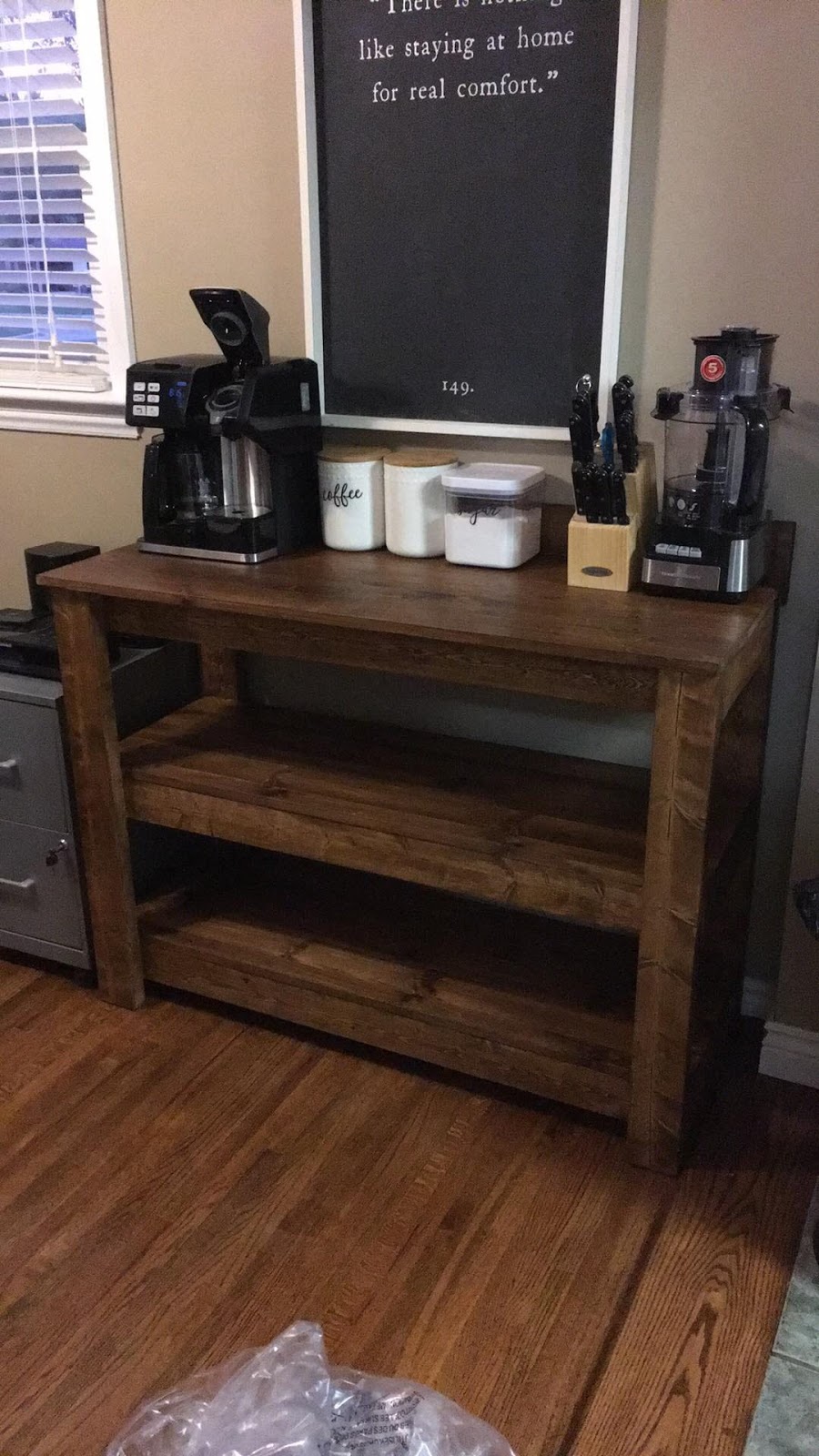 In order to help our daughter organize her kitchen before the arrival of the baby, McG built her a coffee bar. She has a small galley kitchen with not much counter space. In order to free up some of the space and still have a place for her small appliances, like a coffee maker and toaster, she wanted something that wouldn't take up too much space in her dining room. This is what he built for her...